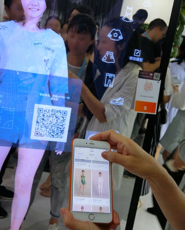 もう1つ、バーチャルフィッティングのHAOMAIYIという企業ですが、元々オンライン上のサービスでしたが、実際のファッション店舗に大型のスマートミラーを設置し、店員がスマートフォンとスマートミラーを使って接客し、鏡を見ながら自分の顔や体型に合わせて着せ替えやカラーチェンジができるリアル店舗でもバーチャルフィッティングをできるようにしました。気に入ればそのままオンラインで注文も出来てしまうというものです。店舗に陳列されている各アイテムのタグにもQRコードが印刷されているので、自分のスマホでも同じ事が出来る仕組みになっています。実際にC&Aや複数のブランドと提携しているということや、中国で圧倒的に普及しているwechatと連携しているため、誰でも直にサービスを利用し、決済まで使えるという点です。オンラインサービスが、オフラインのリアル店舗に展開しO2O2O型のビジネスモデルを展開するこのスピード感も中国ならではでしょう。