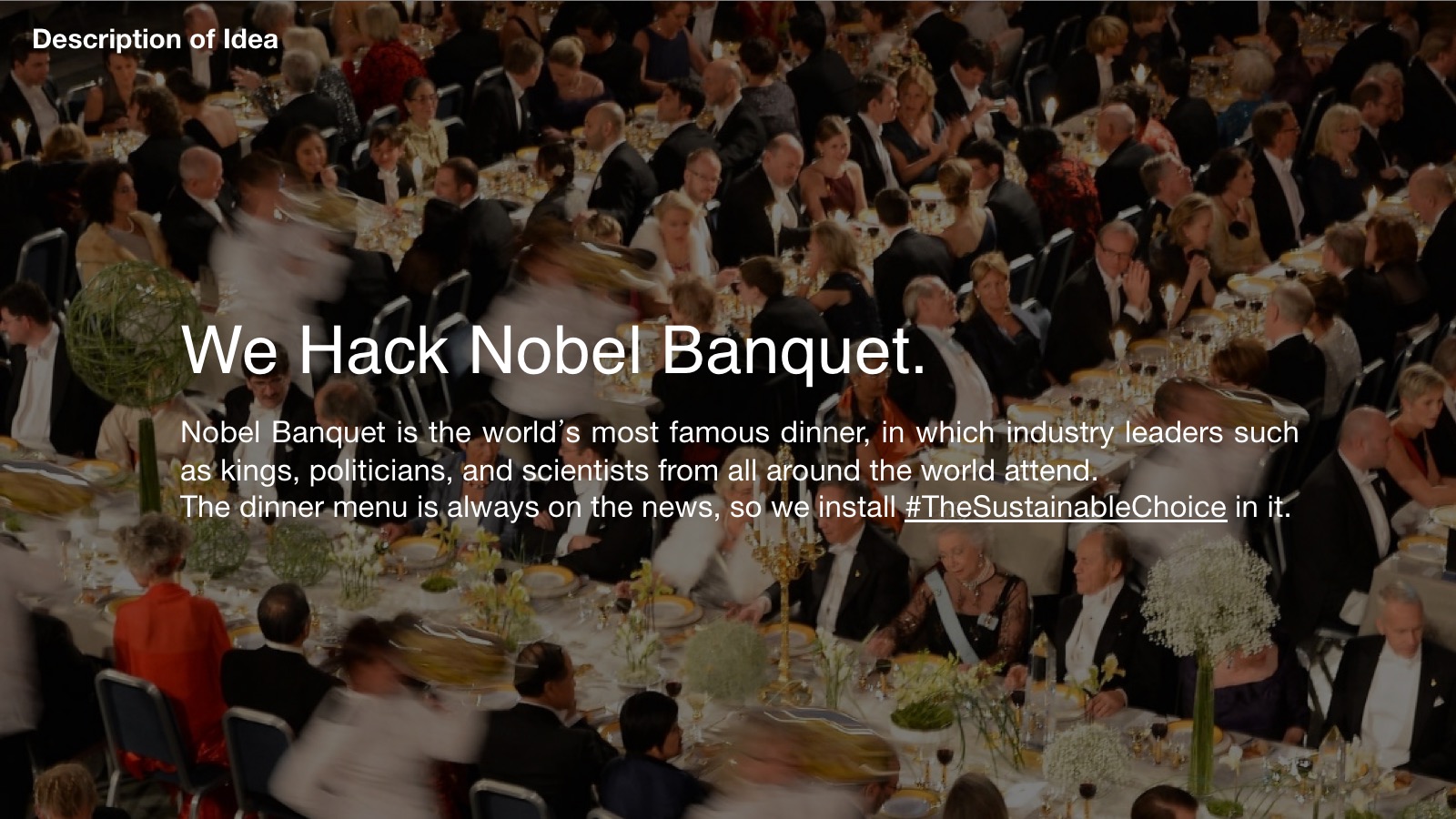 オリエン直後に会場に残り、2人で30分ほど、お互い頭に浮かんだことをすり合わせました。そこで谷脇が「世界一有名なディナー、ノーベル賞の晩餐会をハックするのはどう?」という切り口をくれたんです。