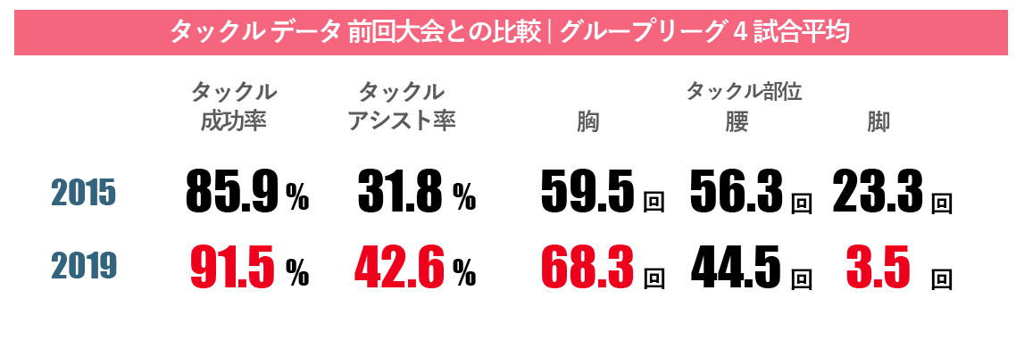 特徴的なのは「脚へのタックル」が非常に少なくなったことです。4年前が1試合平均で23.3回なのが、3.5回となりました。脚へのタックルは成功すれば確実に足止めできますが、かわされるリスクが高い。今大会は弾き飛ばされる恐れのある上半身へのタックルを果敢に行い、オフロード(タックルされながらパスをするプレー)を防ぐのが狙いだと考えられます。