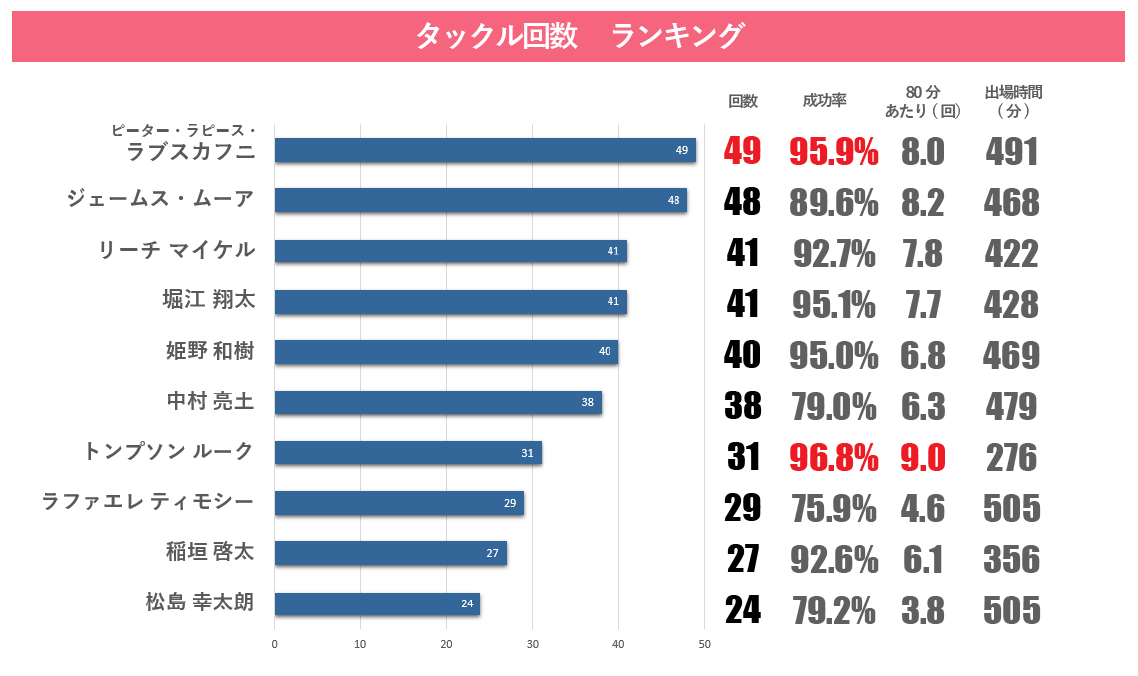 さらに、誰かが上半身へのタックルを行い、サポート役の選手がタックルアシストを行っていく戦略を意識したのでしょう。タックルアシスト率も31.8%から42.6%へ向上しています。
