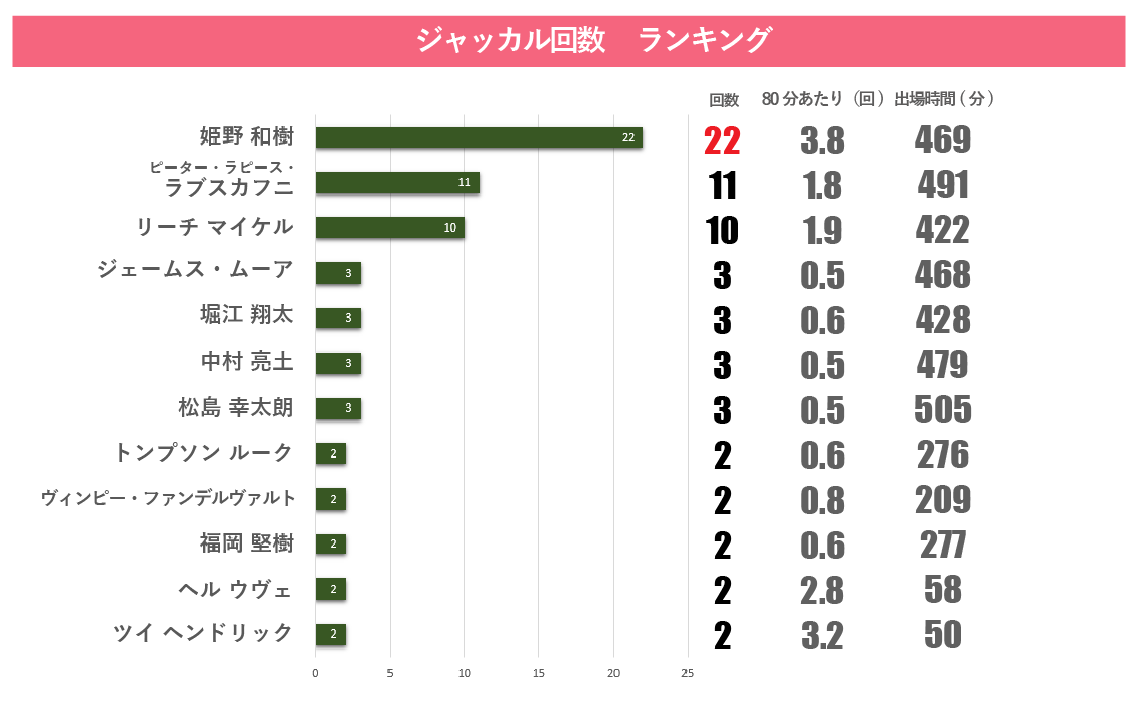 選手個人単位での「回数」を見ると、タックルではピーター・ラピース・ラブスカフニ選手が顕著な働きをしています。合計49回のタックルを行い、成功率も95.9%と高い(図2)。他にも、ジェームス・ムーア選手、リーチ・マイケル選手、堀江翔太選手、姫野和樹選手も、タックル回数の上位に来ます。特に姫野選手は、今回話題になった「ジャッカル」の回数が22回と、2位のラブスカフニ選手の11回を大きく超え、チームトップでした(図3)。