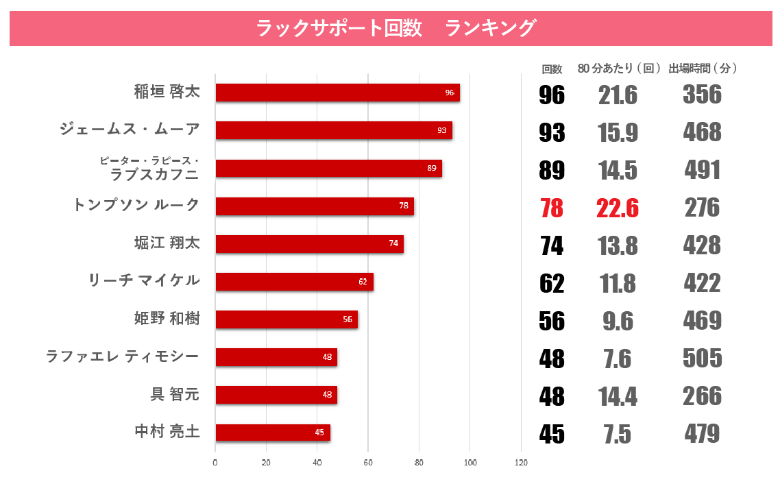 また、データから見える功労者として、私はトンプソン・ルーク選手も挙げたいですね。出場時間としては全体の4分の3ほどなのですが、タックル成功率は96.8%(図2)、ラックサポート数も78回とチーム上位。80分あたりの回数にならすと、チームトップの数値でした(図4)。