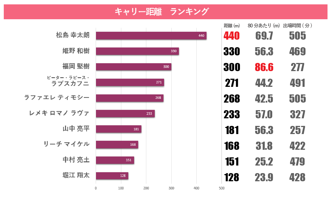 ただ、今大会は積極的に外側へ大きく振り、そこへ松島幸太朗選手など優秀なランナーを配置し、積極的に進めていく戦術に変わりました。実際に、松島選手はキャリー距離が440mとチームトップ、大会全体で見てもトップクラスです(図5)。特筆すべきは出場時間が短かった福岡堅樹選手の277mで、80分あたりの距離に換算するとチームトップです。