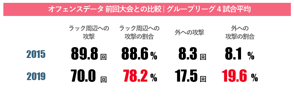 まず、ディフェンス面でいうと、今大会はタックルを中心にしたディフェンスがうまく機能していました。4年前と比べて、タックルの成功率が上がっています。予選プール4試合平均で85.9%だったのが、91.5%と向上しました(図1)。