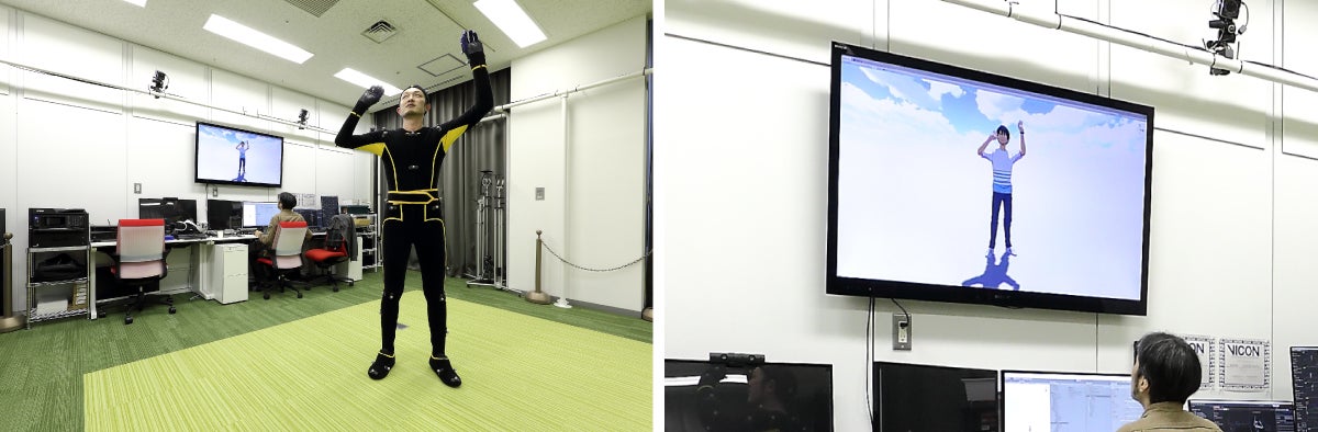 専用のマーカーをつけたスーツを着た人の微細な動きを、スタジオ内に設置した高精度なカメラで捉えてアニメ空間に取り込み、それを適宜組み合わせて一つの世界をつくっていきます。もちろん、キャラクターはすべて別撮りが可能ですし、撮り直しもすぐにできます。
