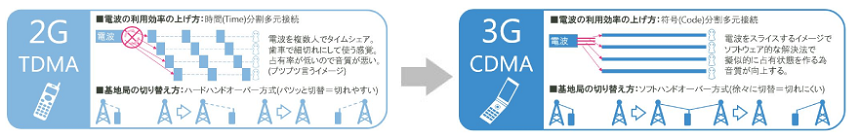 ちょっと専門的な話になりますが、2Gでは電波の利用効率の上げ方は「時間分割多元接続(Time Division Multiple Access)/TDMA」という技術が採用されていました。「時間分割」という名の通り、1つの帯域を時間で分割して分けあえるようにすることで、複数人での利用を可能にします。例えば4人で共用していたとしたら、自分が通信できているのは通話時間の1/4で、残りの3/4は他の3人が通話していました。2G時代「通話中ブツブツいって音質が悪い」と言っていたのは、まさに「時間分割多元接続/TDMA」が理由だったのです。もうひとつ、基地局の切り換え方にはハードハンドオーバー方式と呼ばれる技術を採用していました。こちらは基地局と基地局の間を移動している時に徐々に切り替え……ではなく「パツッと一気に切り替え」という仕組みで、移動中は切れやすいという難点がありました。
