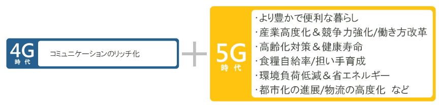 4G時代はコミュニケーションをリッチにするための技術進化でしたが、5G時代は「より豊かで便利な暮らし」「産業高度化&競争力強化/働き方改革」「高齢化対策&健康寿命」などの社会的課題を解決するために必須なものになります。
