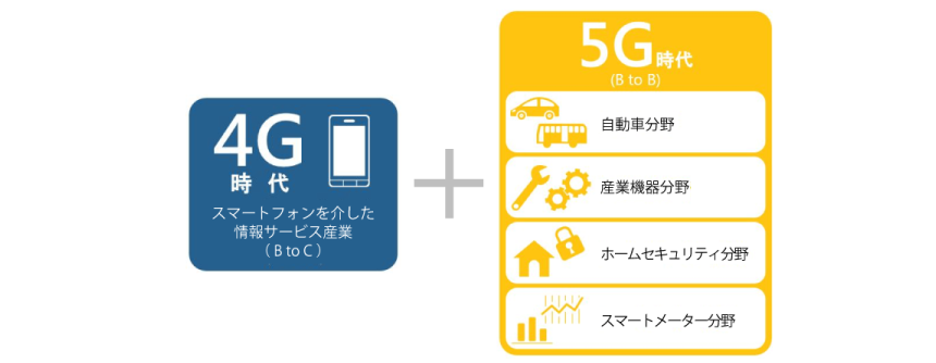 4G時代はスマートフォンを介した情報サービス産業でしたが、5G時代には自動車分野・産業機器分野・ホームセキュリティー分野などの領域に拡がるのです。