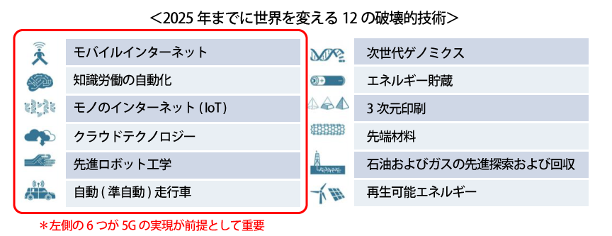 2015年9月の国連サミットで193の加盟国が採択した「Sustainable Development Goals(SDGs)/持続可能な開発目標」の17の目標を2030年までに達成させるためにも、また2013年5月にマッキンゼーが発表したレポートで紹介された「2025年までに世界を変える破壊的技術」の12の技術のうち半分の6つが高度化した無線通信(5G)の実現が前提とされていることからも、理解できると思います。