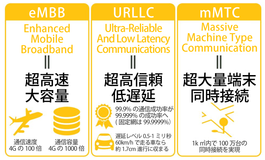 5Gには4Gと異なり、明確な実現目標に向かって国際電気通信連合(ITU)の無線通信部門が要件として定めた「eMBB」「URLLC」「mMTC」という3つの条件があります……が、英語の略語の羅列では意味がわからないですよね。