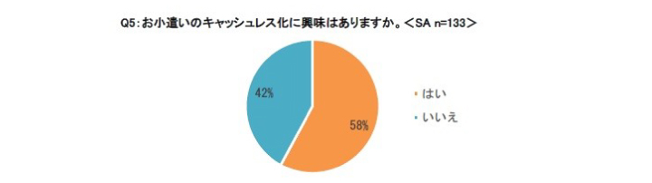 一方で、お小遣いをキャッシュレス化することに興味を持っている方は、およそ6割います。肯定派の意見としては“便利”といった声が多く、否定派の意見としては“使いすぎが心配”といった声が挙がっているようです。