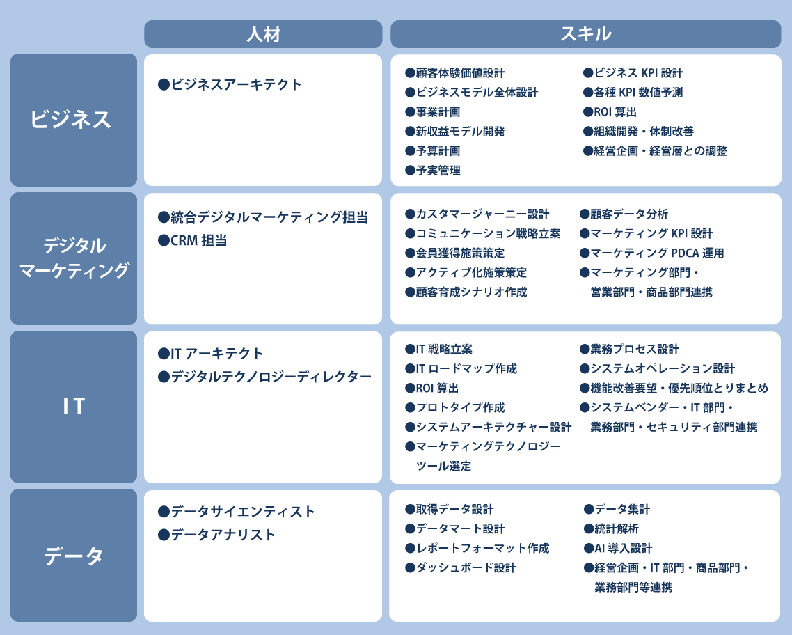 一般的に4分野のリソースが必要です。ビジネス、デジタルマーケティング、IT、データの専門家です(表)。