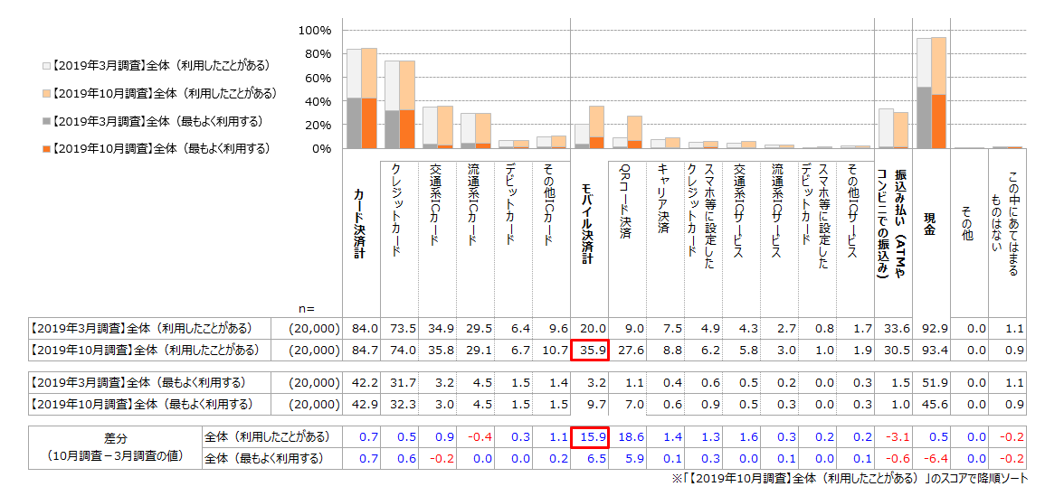 調査では2019年10月の消費増税前後で、決済サービスの利用状況がどう変わったかを調べました。特筆すべきは「直近1カ月以内に利用したことがある決済方法」という質問への回答で、モバイル決済は増税前より16ポイント増という結果になりました(図1)。これは結構な伸びと言って良いと思います。