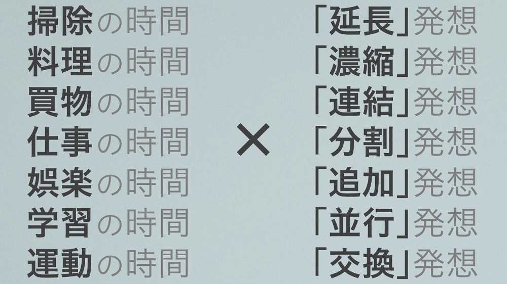 これからの「時間」は、延長したり、連結したり、分割することがもっと簡単になる(下図右)。日常シーン(下図左)を掛け合わせることで、ビジネスチャンスを発想する際のテンプレートとして使用できる。