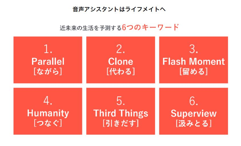 6つのキーワードとの関連で見ると、音声コンテンツが親の代わりをしてくれるという点で「Clone」に、コミュニケーションによって子どもの情操が豊かになるという点で「Humanity」に、さらに子どもの可能性を引き出すという点で「Third Things」に当てはまります。