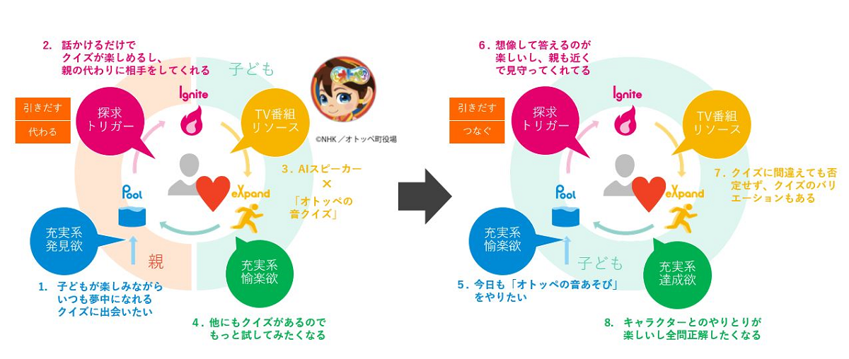 「オトッペ」では、「子どもを楽しませたい」という親の欲求がPoolに、「忙しいときに子どもの相手をしてくれるという」と発見がIgniteに、「話しかけるだけでクイズなどが楽しめる」という子どもの体験がeXpandに該当します。そこからさらに「今日もオトッペの音遊びがしたい」という子どもの欲求が次のPoolにつながる。そんなループが成立しています。