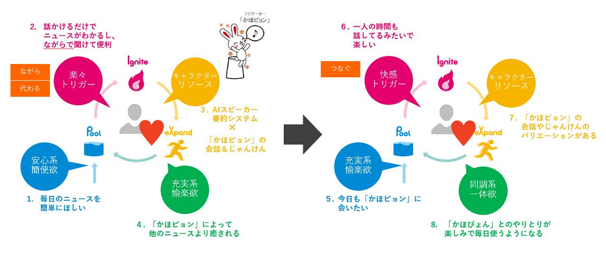 河北新報ニュースの場合は、Poolは「ニュースを手軽に知りたい」という欲求、Igniteは「話しかけるだけでニュースが聞けて便利」という簡便さの実感、eXpandは音声ニュースのナビゲートを務めるキャラクターである「かほピョン」とのコミュニケーションの楽しさと考えられそうです。そこから、「かほピョンのニュースが聞きたい」「今日もかほピョンと対話がしたい」というPoolにループしていくという流れです。