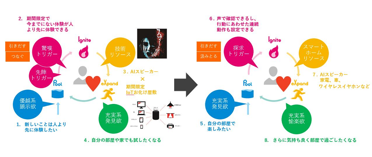 「スマート怪談」は、「人より先に新しいものを体験してみたい」とか「人に自慢したい」といった欲求がPoolでありIgniteにもなると言えます。そこから、「音声とIoTの組み合わせを自分の家で試してみる」というeXpandにつながり、さらに「もっといろいろなことを試してみたい」というPoolになっていく。そんなループが描けます。