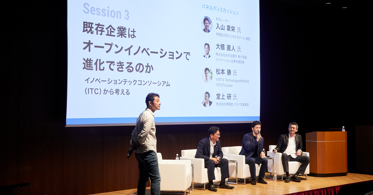 日経バリューサーチ 価値創造マネジメントフォーラムのパネルディスカッションに、博報堂「ミライの事業室」の堂上研が登壇。早稲田大学ビジネススクールの入山章栄教授の進行のもと、オープンイノベーションに携わるパネリストの方々と議論を交わしました。