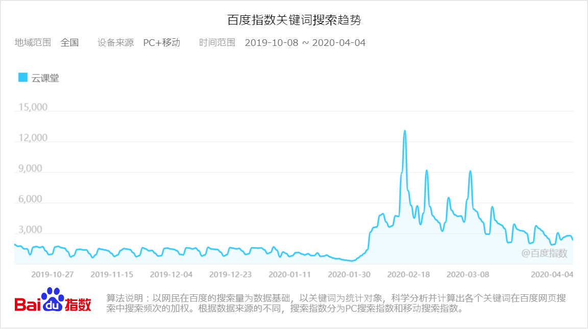 ここでBaidu指数をみると、「雲遊ライフ」の拡大を象徴する「雲課堂(=教室)」という類の教育系クラウドサービスへの関心度は1月末の春節休みを境に急上昇したことが顕著に表れています。その後も毎週月曜日がやってくるたびに、「雲課堂」を注目する人が急増することは見ての通りです。