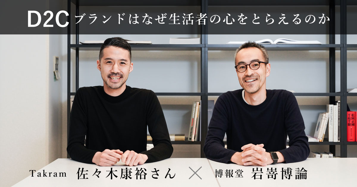 D2Cについての著書を上梓されたデザイン・イノベーション・ファーム Takramのビジネスデザイナー佐々木康裕さんと、博報堂「ミライの事業室」のビジネスデザイナー岩嵜博論が、D2Cモデルの本質と、生活者の時代のブランドビジネスのありかたについて語り合いました。