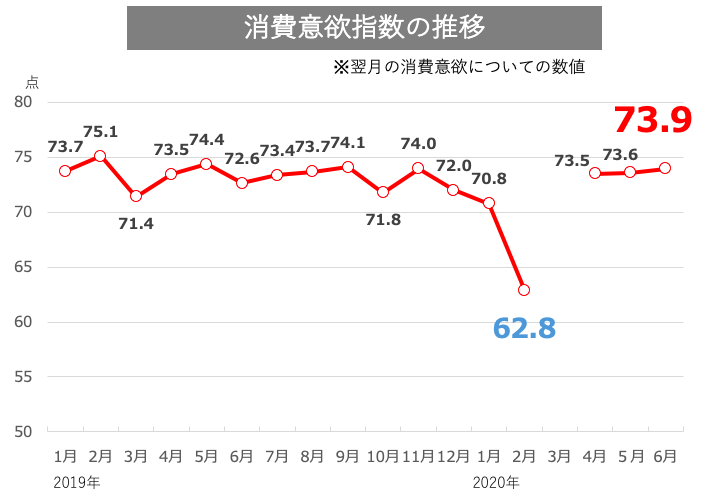 これまで消費指数は概ね70点以上で推移していたのですが、新型コロナウイルスの流行が深刻となった2月時点で大きく低下し、その後すぐに元の水準に戻っていることが分かります。