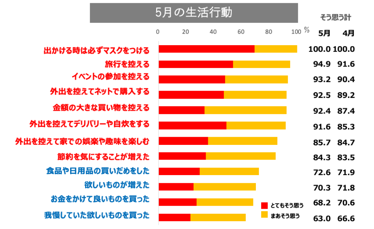 ここで中国の生活者の生活行動変化を見ていくと、新型コロナウイルスの感染拡大が収束しつつある現在においても外出時にはマスクを着用したり、旅行や金額の大きな買い物を控えており、お金をかけて良いものを買おうとする行動や我慢していた欲しいものを買うような積極消費型の行動が低い状況となっています。この傾向は4月と5月を比較しても大きな変化はなく、「リベンジ消費」と呼べるような大きな生活行動の変化は見て取れません。