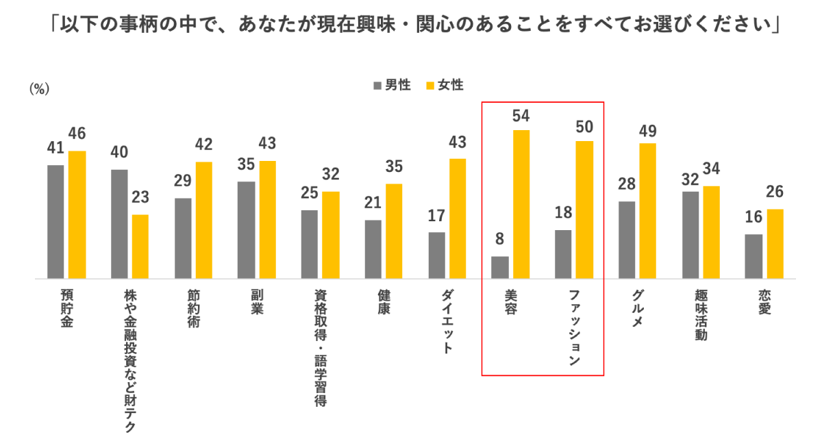 実はキャリジョたちにとって、美容・ファッションはグルメ・キャリア・恋愛よりも関心が高い普遍的なテーマ。そして働く男女のうち、男女差が最も大きい領域でもあるのです。