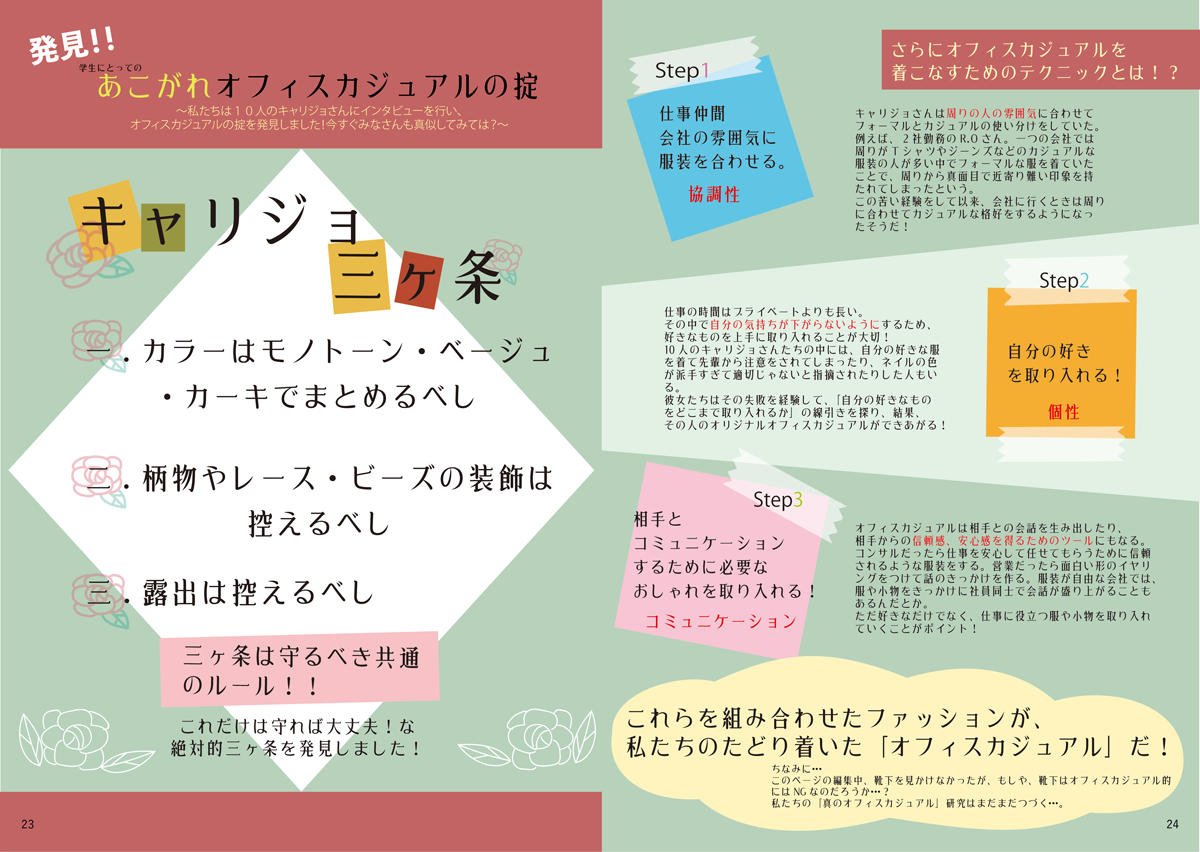 左側にはまず守るべき掟。そして右側には、もっと素敵なキャリジョになるために有効なテクニックが1、2、3のステップで示されています。この構成はとてもいいなと思いました。取材を通じて、キャリジョのみなさんが周囲の雰囲気に応じてカジュアルに寄せたりフォーマルに寄せたりとファッションの工夫をしていることが見えてきました。協調性を持ったうえで、個性も出し、さらにそれをコミュニケーションにつなげる。こうした、まさに女性ならでは、キャリジョならではの仕事への向き合い方について、学生の皆さんにも見つけていただいたことが私はすごく嬉しかったですね。