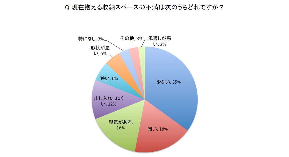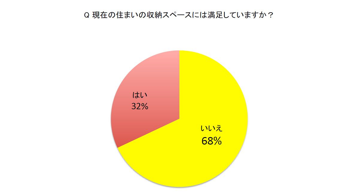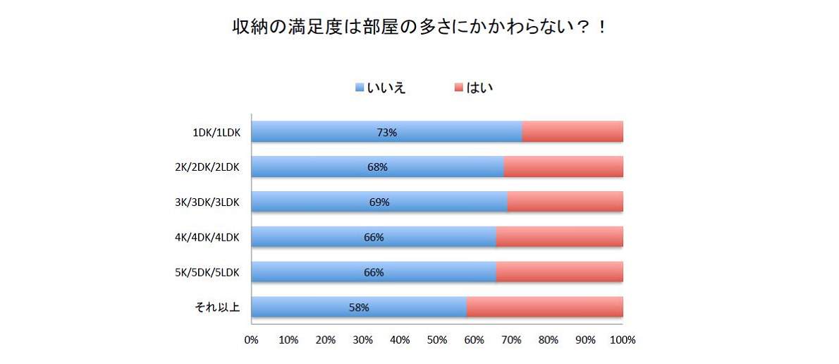 そもそもみなさん収納スペースは足りているでしょうか?下記のデータを見ると部屋の多さにかかわらず、全体の約7割の方に収納満足度が足りていないこととそれぞれの悩みがわかります。