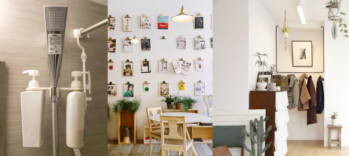 毎日使うシャンプーリンス、歯磨き粉や歯ブラシ、石けん、洗面器など、水回りに置いておくことの多いこれらのものは、壁が傷つかず取れにくいマグネットや引っ掛けるクリップで浮かせて空間を利用し、手の届きやすい場所で使用しやすくなっていました。そしてとにかく乾きやすい。シャンプーリンスは特に底面がヌルヌルしやすく、お掃除も手間がかかりますよね。ここが一つの浮かせポイントかと思いました。