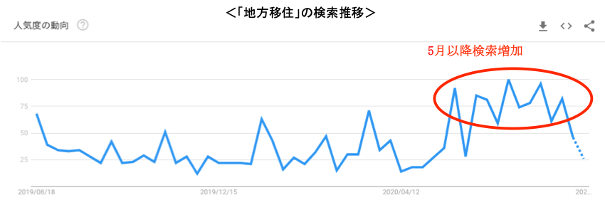 まず、Googleトレンドで「地方移住」と検索すると、5月以降明らかに検索数が伸びていることがわかります。「地方」というと様々な解釈がありますが、いずれにせよ都市部からより郊外への移住を検討していることがわかります。