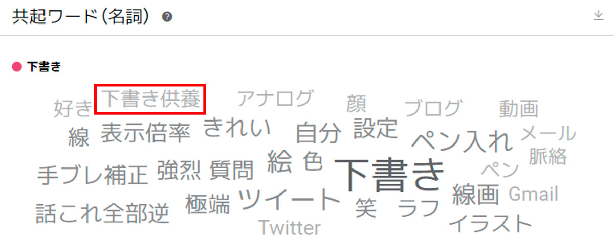 実際にSNSにおける「下書き」というワードの共起語を見てみると、「下書き供養」というワードが既に挙がってきます。これは、実際に下書きを公開する際に、あえて「#下書き供養」というハッシュタグをつけることから、共起語にランクインしたものとみられます。
