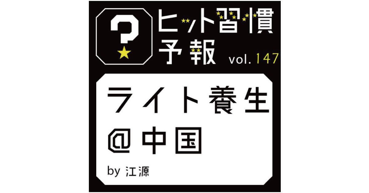 ヒット習慣を週刊で予測する連載コラムの第147回目。今回は、養生といえば、日々の努力を積み重ねるなどハードなイメージがありますが、手間暇かけて大した努力もせず、手軽に養生をする若者がだんだん増えてきているという「ライト養生」がテーマです。中国湖南省出身の江源が、その背景や実態について紹介しています。