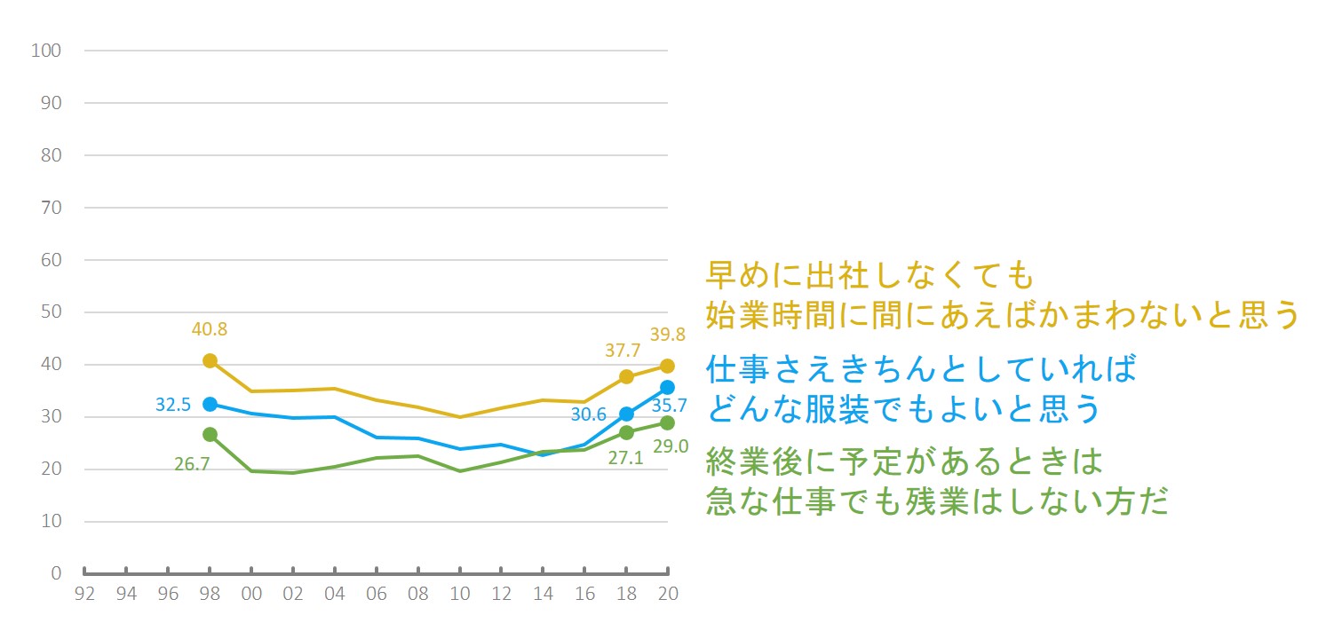 その流れは働き方でも同様で、例えば職場の規範について「早めに出社しなくても始業時間に間に合えば構わないと思う」「仕事さえきちんとしていれば、どんな服装でも良いと思う」「終業後に予定があるとき急な仕事でも残業はしない方だ」といった項目が増加して、個人の働き方の裁量権を拡大しようとする意識が高まっています。