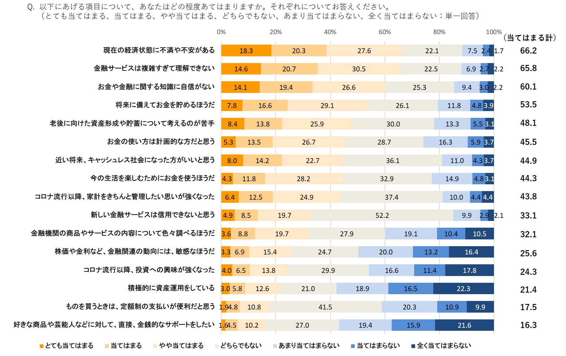 続いて、お金に関する意識・行動について聞いたところ(図2)、最も高かったのが「現在の経済状態に不満や不安がある」(66.2%)で、生活者の経済的不安が高まっていることを感じます。ただ一方で、「積極的に資産運用をしている」と回答した人は21.4%と、経済的な不安を感じながらも投資・資産運用を行う人はまだ多くありません。この状況について、岡部さんはどのようにお考えですか。
