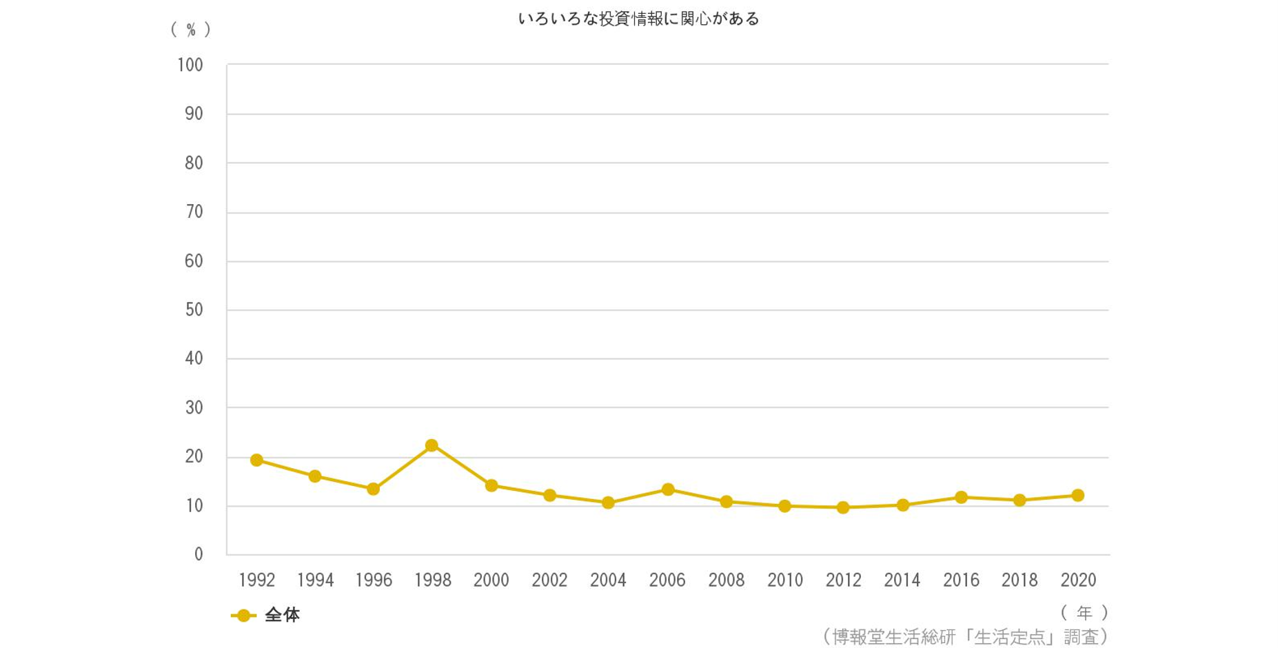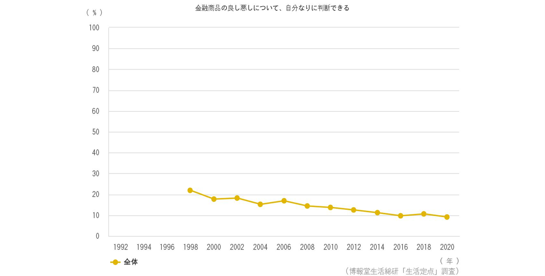 投資や金融に関する結果を見ると、「いろいろな投資情報に関心がある」と答えた人の割合は、98年には22.2%ありましたが2004年には10.5%まで下がり、その後は10%前後で推移しています。一方で「自分がもらう年金に不安を感じる」と回答した人は、1998年から一定して約7割いるんです。年金不安は20年以上経ってもまったく変わらない一方で、それを補うために投資への関心が高まっているかと言ったらそうでもない。また、「金融商品の良し悪しについて、自分なりに判断できる」と答えた人の割合は年々下がり続けていて、2020年には10%を切っています。