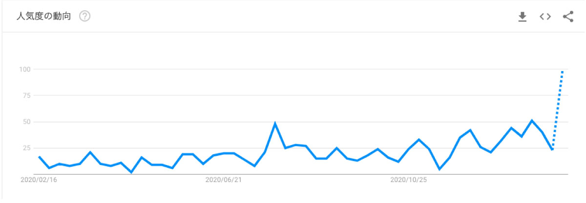 もしかしたらZ世代という単語自体、聞き慣れない方もいらっしゃるかもしれませんが、1990年代中盤以降生まれの若者を指すことばとして使われており、X世代、Y世代(ミレニアル世代)の次の世代を指す単語になっています。Googleトレンドで検索数の推移をみてみても、2020年の半ばあたりから徐々に検索数が伸びていることも見て取れます。