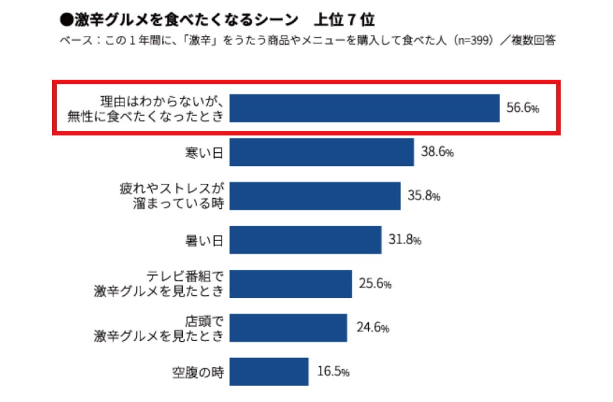 興味深い調査があります。2018年に実施された調査によると、激辛の食べ物を1年以内に食べた人は全体の40%もいて、そのうちの約5割は「理由はわからないが無性に食べたくなるから」食べていたそうです。美味しいとか、ストレス発散とかではなく、もはや本能が辛いものを欲しているようです。