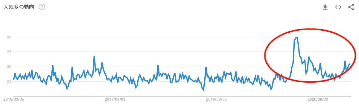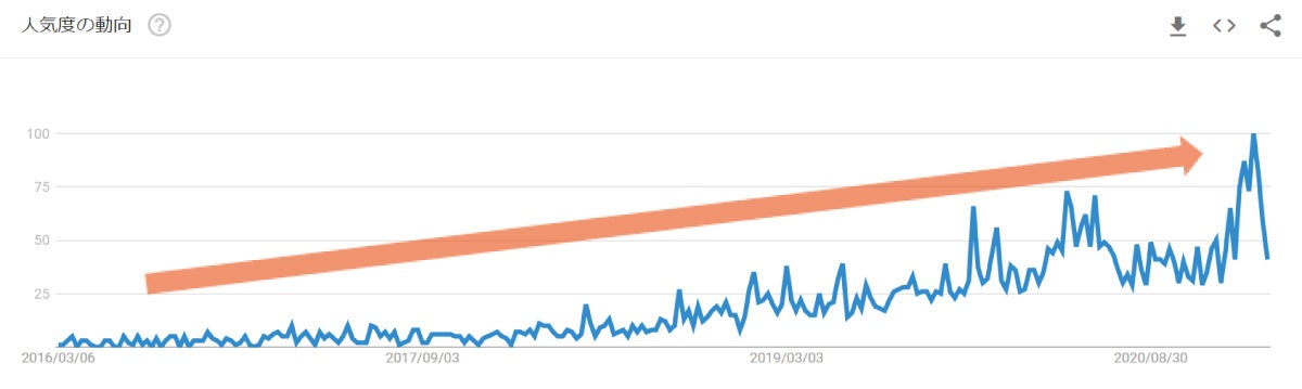 皆さんは、「ファスティング」をご存じでしょうか。ファスティングとは断食のことを指します。昨年コロナ禍で自分の自由時間が増え、生活習慣が見直された中で、体質改善の方法として注目されました。下記のGoogleトレンドをご覧ください。過去5年間の推移を見ると、現在に至るまで注目度が高まっていることがわかります。