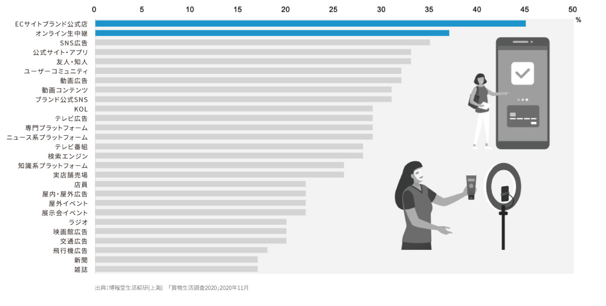 まず、一つ目の特徴としては、情報接触行動の変化があげられます。生活綜研(上海)の「買物生活調査」によると、「買物をする際に、最も影響を受けている情報源は何か」と聞いたところ、マスメディアやKOL(Key Opinion Leader)をおさえて、「ECサイトの公式店舗」及び「オンライン生中継」が上位にランクされました。また、友人・知人、ユーザーコミュニティなどによる口コミ情報も上位にきています。