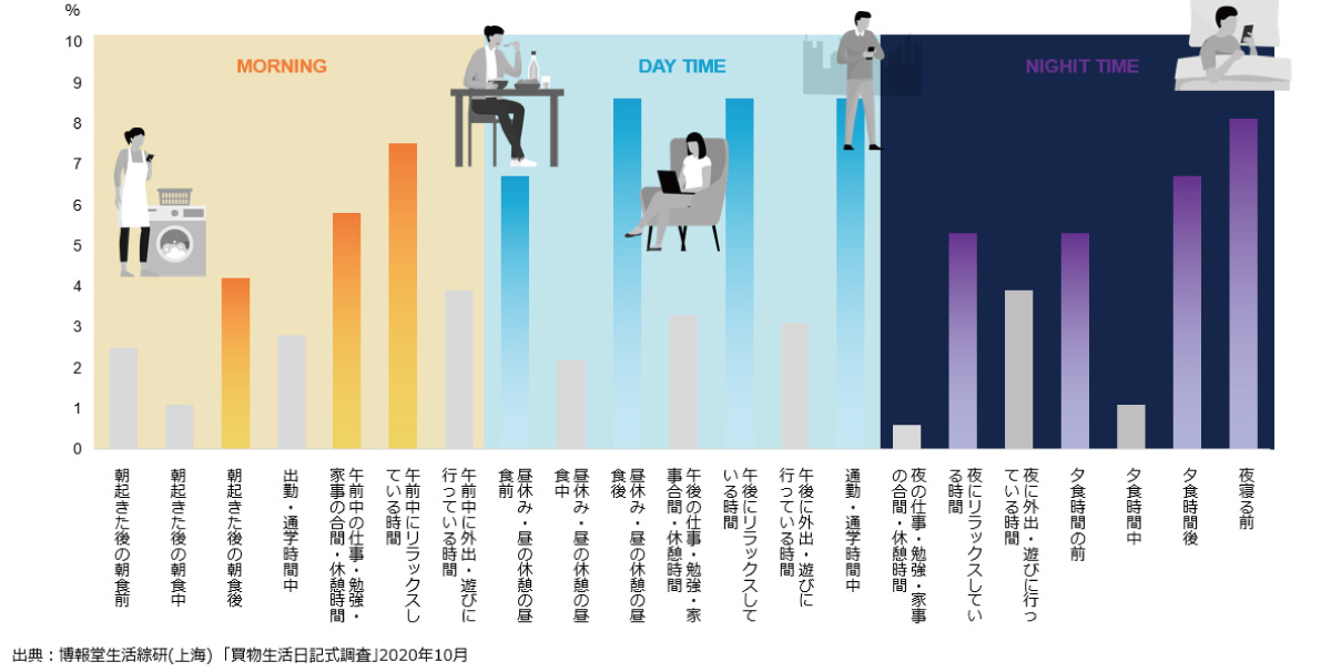 続いて、買物行動変化の2つ目の特徴として、買物プロセスにおける購入タイミングの変化があります。オンラインショッピングがすでに普通になっている中国では、図②が示している通り、購入のタイミングが分散化しています。通勤途中や、昼間の休む時、夕食の後、寝る前など、日常生活のすき間時間のほとんどが買物行動に費やされています。