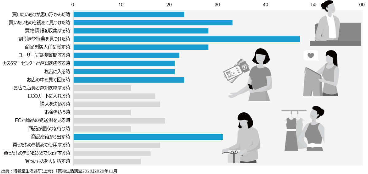 また、「買物プロセスにおいて“楽しい”と感じる瞬間はいつか」という問いに対して(図③)、購入前の情報収集(特に「割引や特典を見つけた時」は突出)~購入時のカスタマーセンターや店員とのやりとり、購入後に「発送済」の文字を確認する時、商品を箱から出すとき…といった具合に、“買物の楽しさを感じる瞬間”が各段階で複数存在しており、それは購買プロセス全体に行き渡っているのです。
