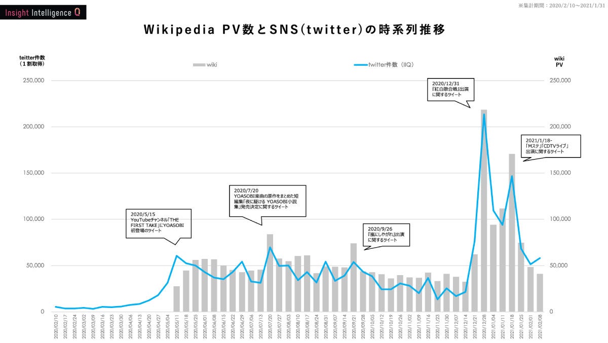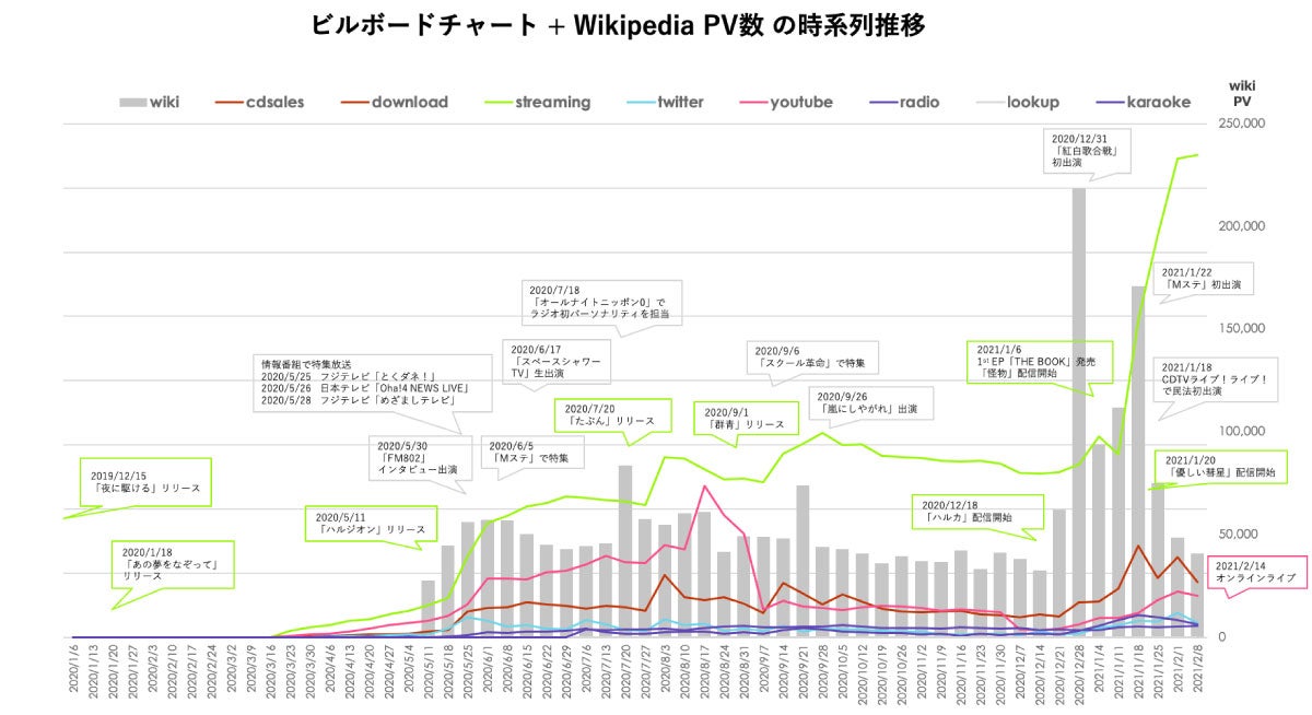 ではBillboardさんのチャートデータや弊社で持っているデータを組み合わせて、YOASOBIの過去1年を振り返ってみたいと思います。折れ線グラフはBillboardさんのデータで、CDやダウンロード、ストリーミング、ツイッター、YouTube、ラジオ、パソコンでCDを読み込んだ回数を示すルックアップといった指標をプロットしたもの。棒グラフはWikipediaのYOASOBI のページが週ごとにどれくらい見られたかを示しています。データは昨年1月から今年2月まで取得していますが、最初の1年はおそらくファンに認知された時期で、紅白後あたりからはエンゲージメントの時期になっていると見ています。「夜に駆ける」のリリースが2019年11月で、その後新曲のリリースごとに、ストリーミングチャートのポイント数を示す線が階段状に伸びている。紅白やEPの影響かはわかりませんが、今年に入ってからの伸び率はすごいですね。これまでのアーティストさんの場合、ストリーミングのチャートとWikipediaのPV数のピークはほぼ一致するんですが、YOASOBIの場合一致していません。おそらくストリーミングを利用する層とWikipediaを見る層が少しずれているからかと考えています。