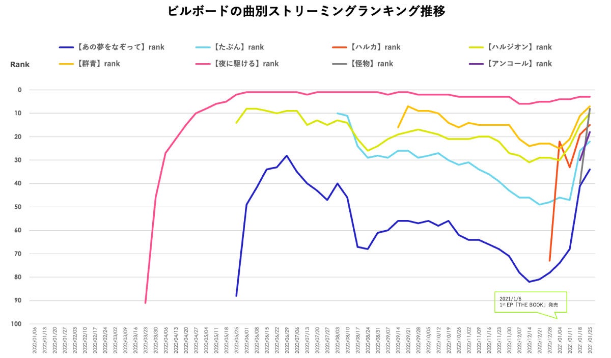 なるほど。では曲別のストリーミングランキングの推移を見てみましょう。ストリーミングは新曲が出るタイミングでそのほかの曲も伸びる傾向がありますが、大晦日の辺りはほかの楽曲も一気に伸びています。そして「夜に駆ける」は半年以上ずっとランキング上位。すごいです。