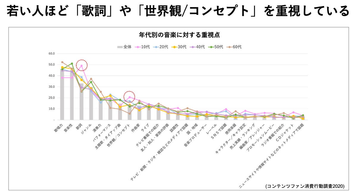 続いて弊社の調査データ「コンテンツファン消費行動調査」に沿ってお話します。まず「年代別の音楽に対する重視点」を見ると、若い人ほど歌詞や世界観/コンセプトを重視していることがわかります。YOASOBIの楽曲をつくる際、若い子たちが反応するような何かを意識されていますか?