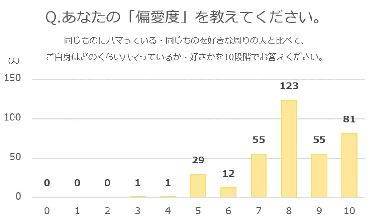 実際に、トモノカイのアンケートで10段階での「偏愛度」を問うと、357名の大学生うち81名の回答者が、最も高い「10(人と比べて異常なくらい偏愛している)」と回答しました。