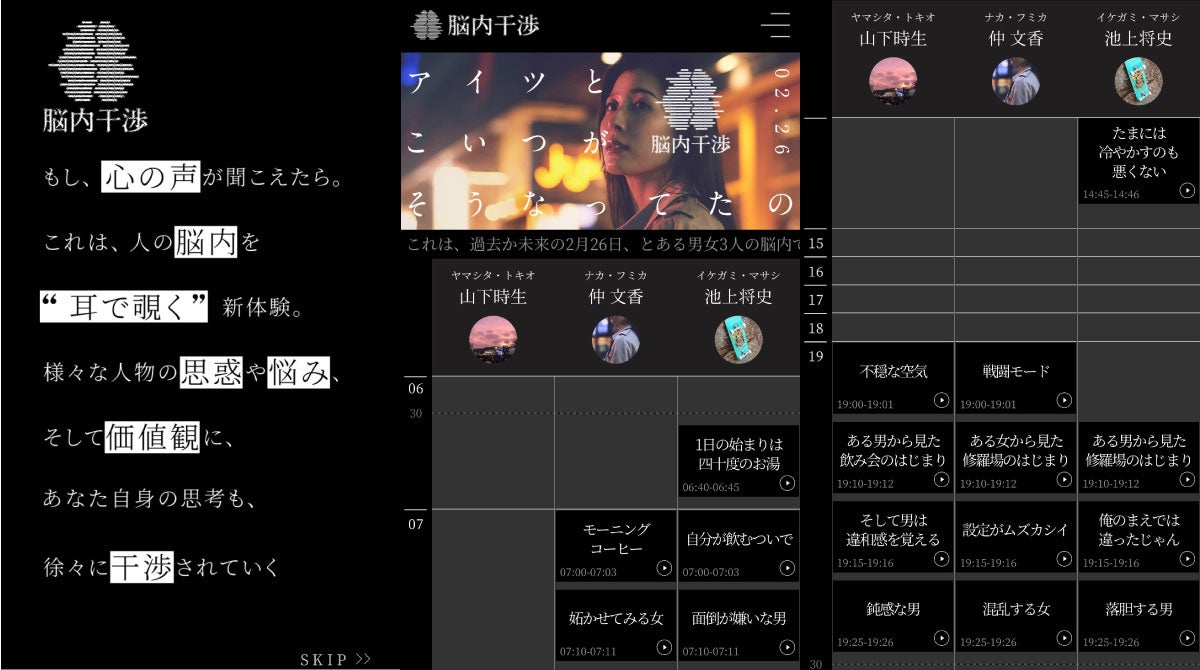 人の脳内を"耳で覗く"という、新しい没入体験ができるボイスドラマです。タイムスケジュール形式になっていて、自分で音声を選んで聴いていくスタイル。3人の登場人物の1日を覗き聴くことで、ひとつのストーリーが完成するようにできています。