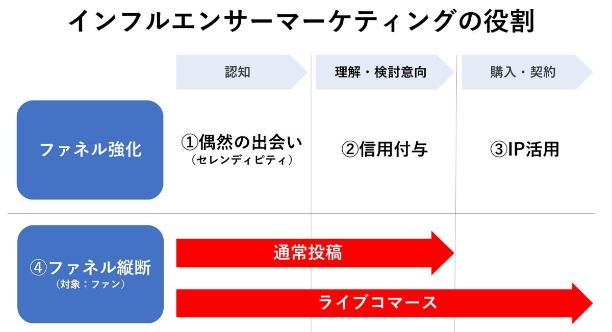 最後、4つ目は、「認知から検討意向の獲得や、場合によっては購入まで一気に進める」ことができます。書籍に例えるとわかりやすいと思いますが、例えば知人や有名人、記事などでおすすめされている書籍をその場ですぐ買ってしまった経験をもつ人は多いのではないかと思います。これと同じで、それまでは全く知らなかったものを、インフルエンサーというフィルターを通すことで、認知から購買まで一気に進めることができます。中国などで盛んなライブ配信はその典型例だと思います。日本ではこうした取り組みはまだまだこれからですが、この特性をうまく活用していけば、新しいタイプの顧客をより獲得しやすくなるのではと思います。