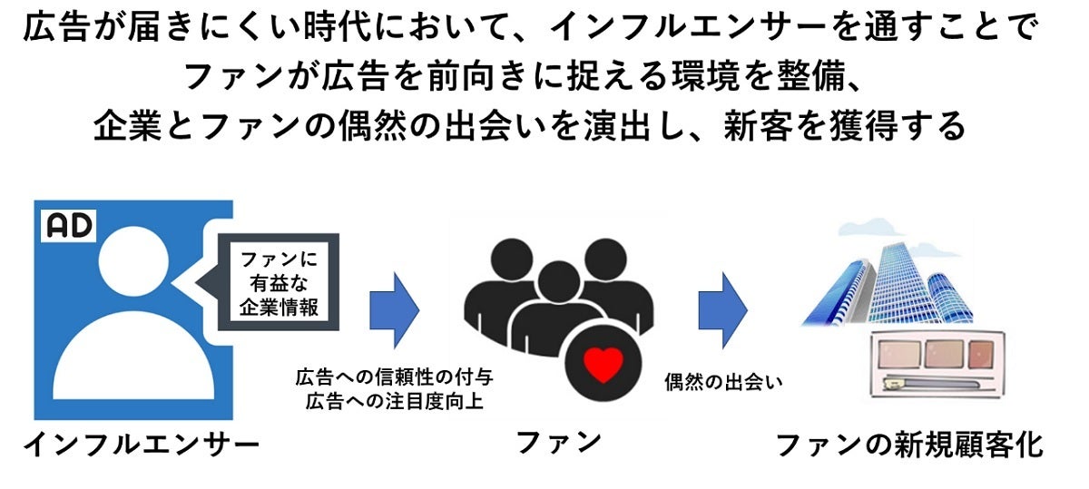 この点において、インフルエンサーマーケティングは、インフルエンサーを経由することで生活者の聞く耳をつくり、たとえそのブランドや商材に関心がなかったとしても「こんな商品があるのだ」という新しい出会いをつくることができ、その人が紹介するくらいだからよいものなのだろうと思ってもらえる。さらに、企業がクリエイティブを作らなくても、インフルエンサーがファン・フォロワーにとっておそらくAI以上に最適なクリエイティブを自らつくり、届けてくれます。